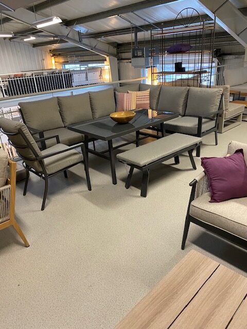 Lounge Alu anthrazit, Hoher Rücken 326 x 247 cm, auch Spiegelbildlich zu stellen. EinMittelteil ca. 80cm kann weggenommen werden, zum einzeln stellen, ergibt 247×247 cm. Mit Hocker-Tisch, ohne Sessel 2890,-Angebot 1990,-