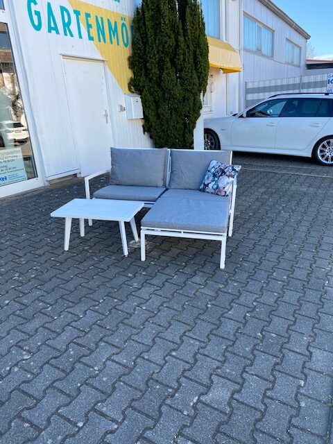 Alu Lounge weiß, wie gesehen mit Kissen ca. 170x150cm, jedes Teil auch einzeln zu stellen kompl. Euro  690,-  Tisch ca. 75x50cm Euro 149,-  Verkauft