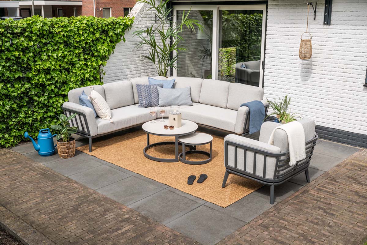 Alu Lounge Taube, Rope Beige  271 x 250 cm, Sessel B. 75 cm, Tische 80cm u. 60 cm rund.