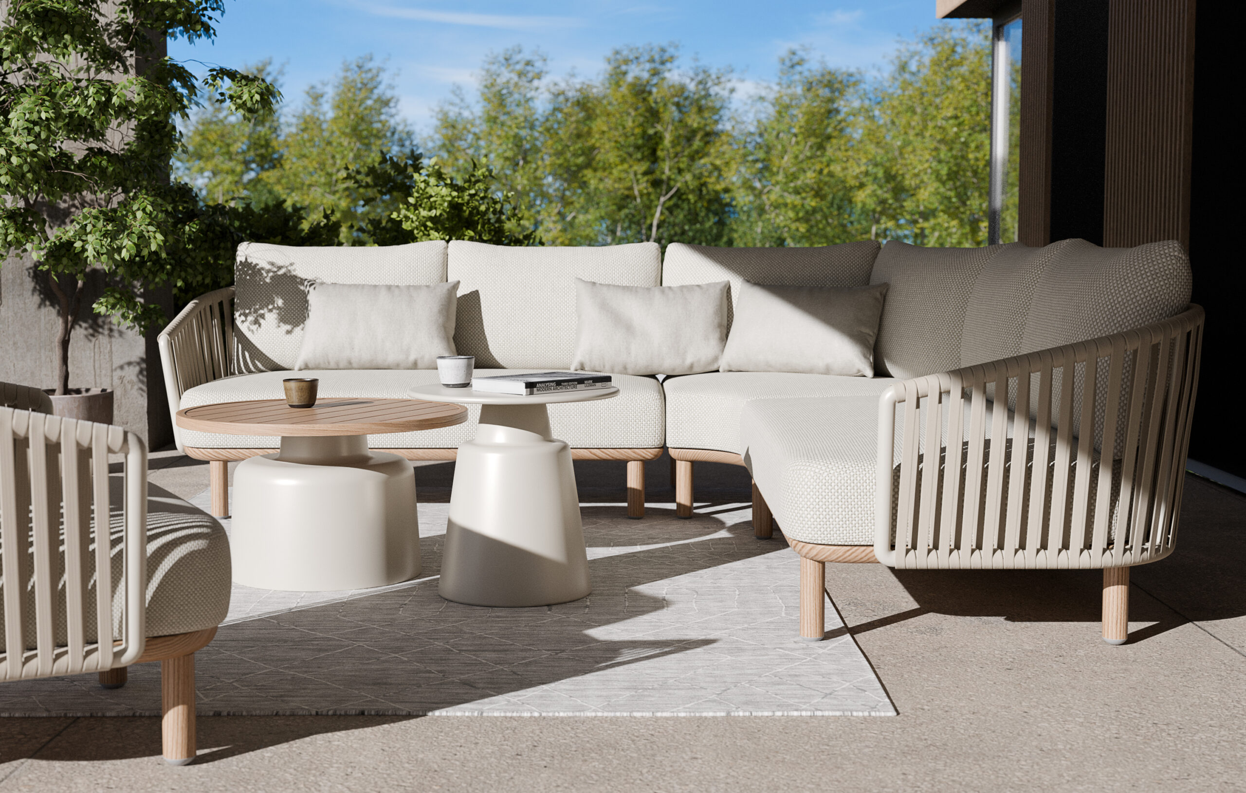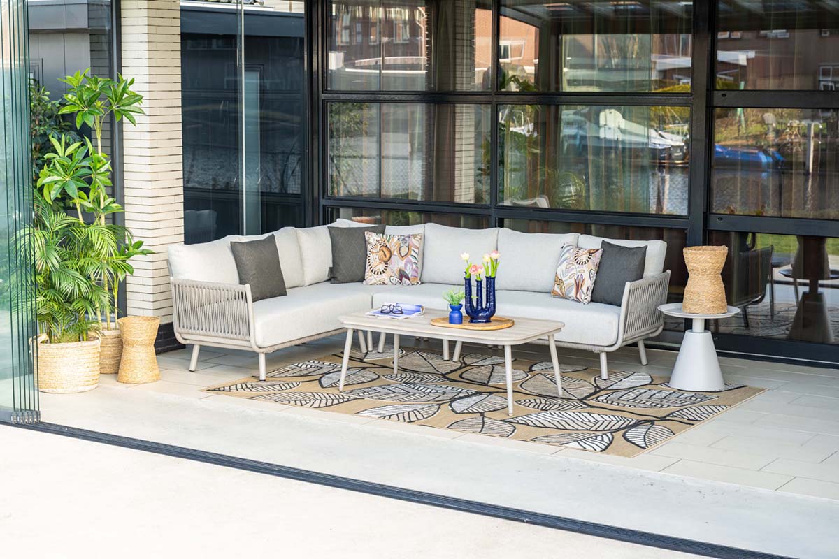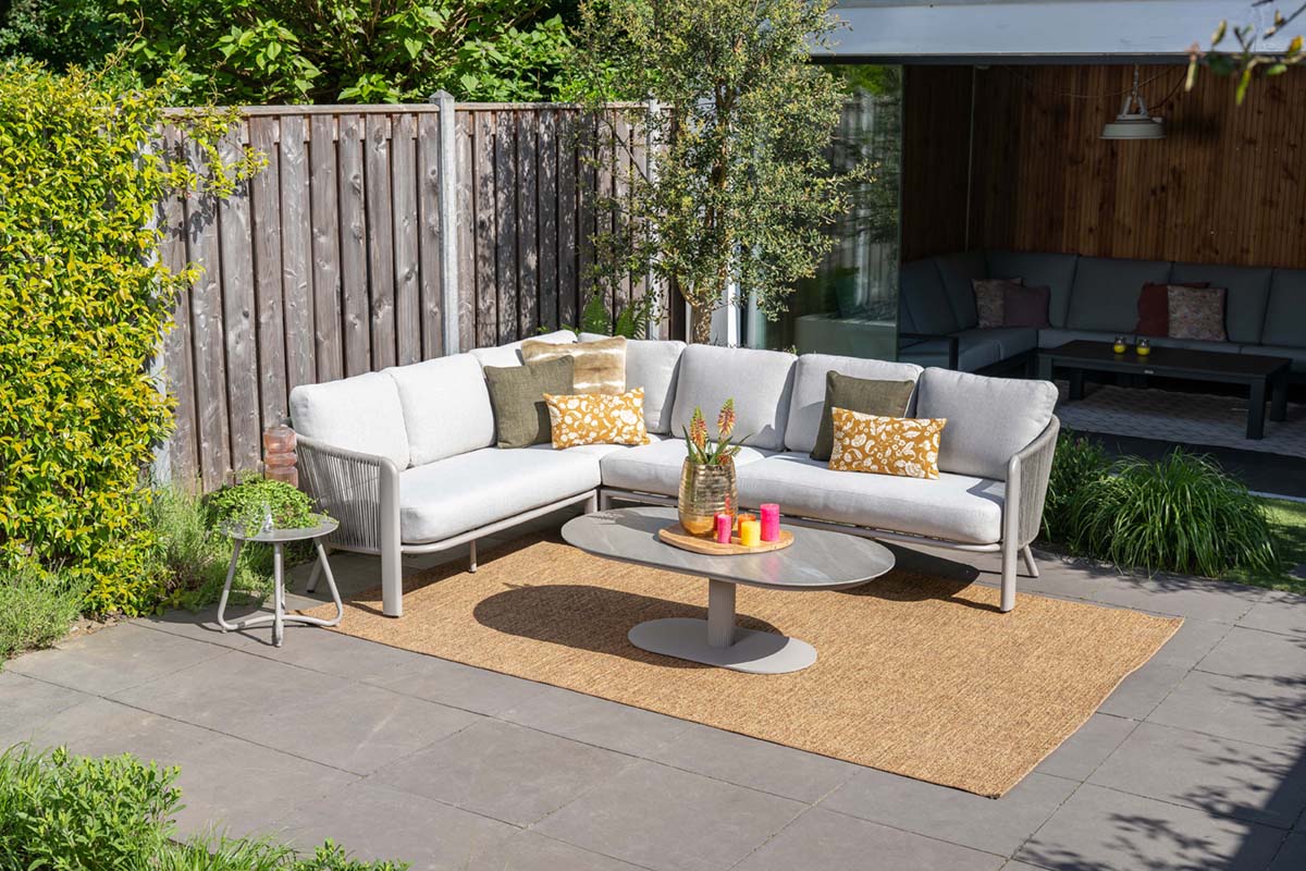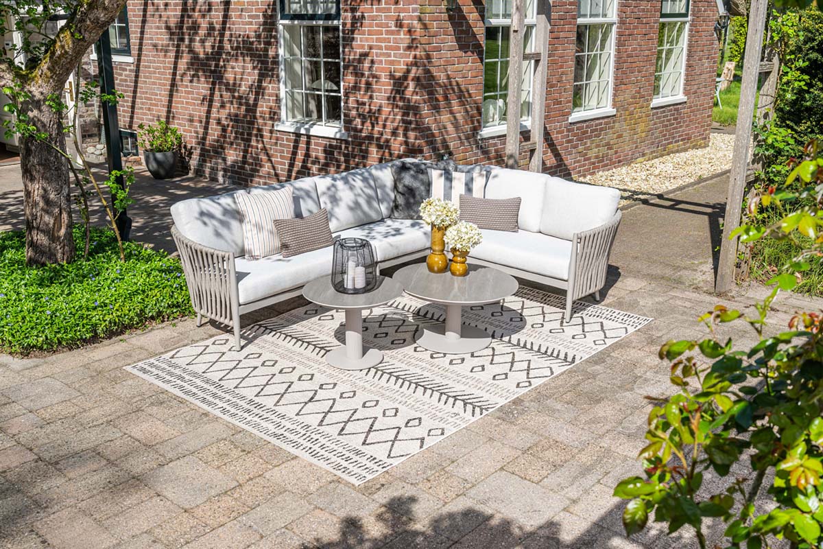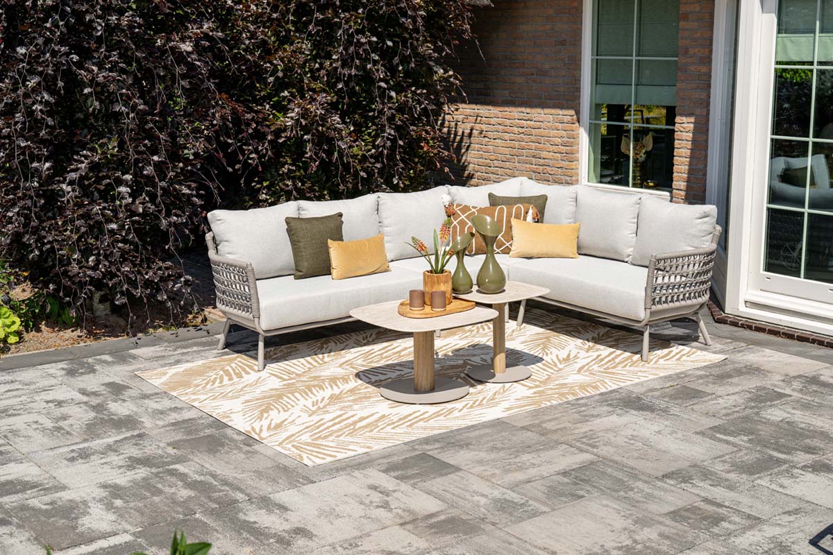 Lounge Alu beige, Rope sand, Bezug beige  270 x 270cm, mit Tische Ceramic 75 cm rund H. 36 cm, Tisch 50 cm rund H. 43 cm.