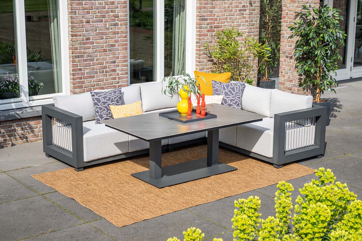 Bankgruppe Alu anthrazit, Rope dkl. grau, Sofa 197 x 73 cm, Sessel B. 71 cm, Tisch HÖHEN VERSTELLBAR H. 52 bis 75 cm. Bank 140 x 40 cm.