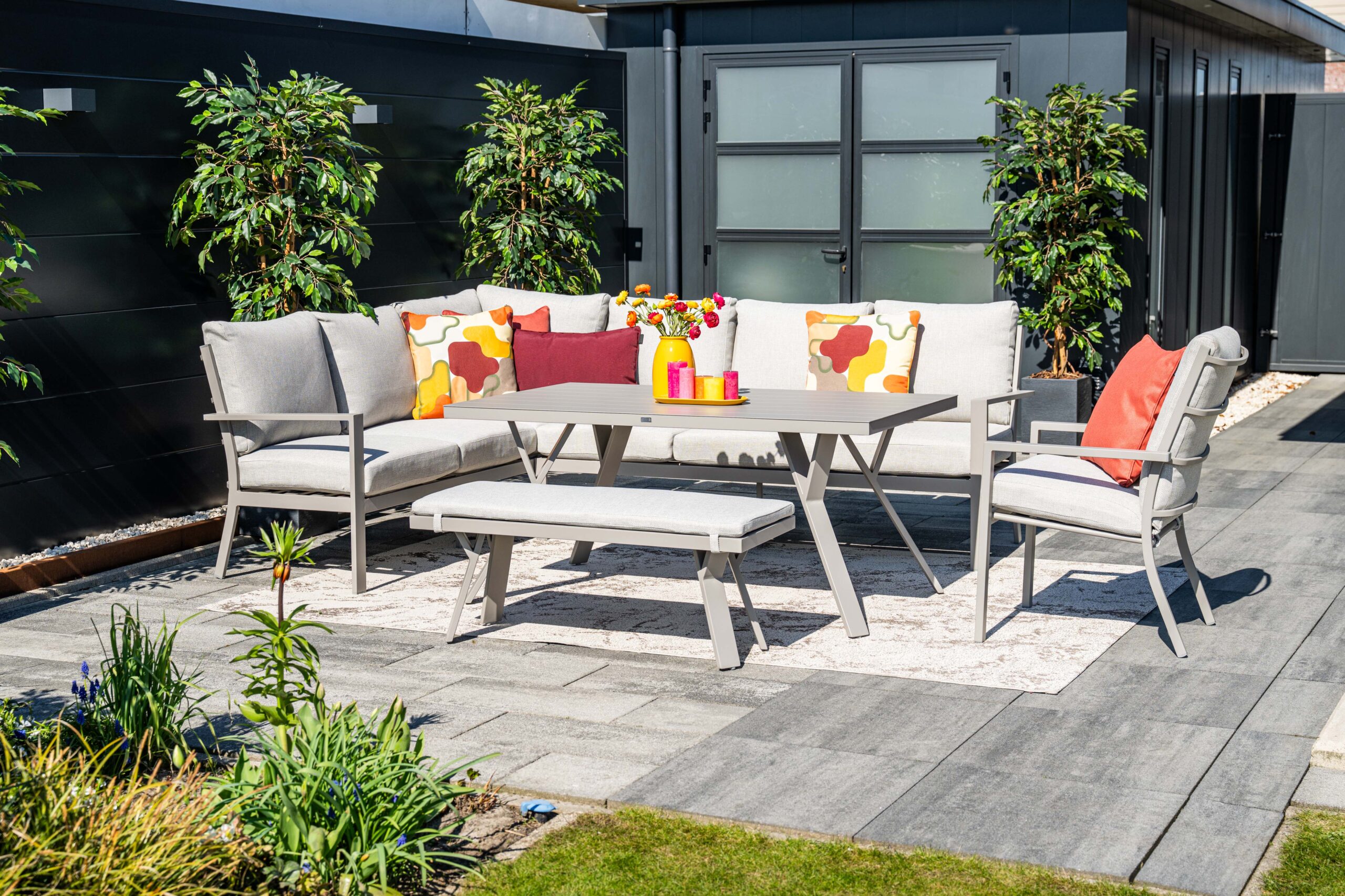 Alu Ess Lounge Rope dlk. grau , Kissen beige 203 x 266 cm , auch Spiegelbildlich lieferbar. Tisch 150 x 87 cm HÖHEN VERSTELLBAR  H. 52 bis 75 cm . Bank 120 x 40 cm.