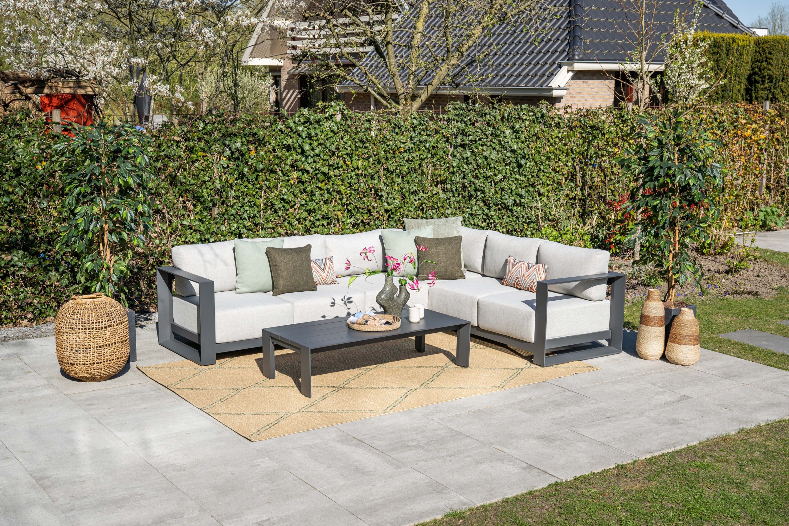 Ecklounge Alu anthrazit , Kissen beige  280 x 280 cm, Tisch 86 x 86 cm H. 26 cm, Tisch 64 64 cm H. 21 cm.