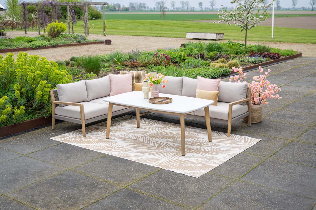 Acacia Lounge, Kissen Beige  270 x 196 cm, auch Spiegelbildlich lieferbar. Tisch 130x70x40cm.