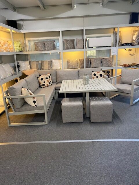 Lounge Alu Beige, Rope beige, Kissen Vanilla 300 x 236 cm, auch Spiegelbildlich, und kleiner lieferbar. Hocker 64 x 75 cm, Tische in verschiedenen Größen.