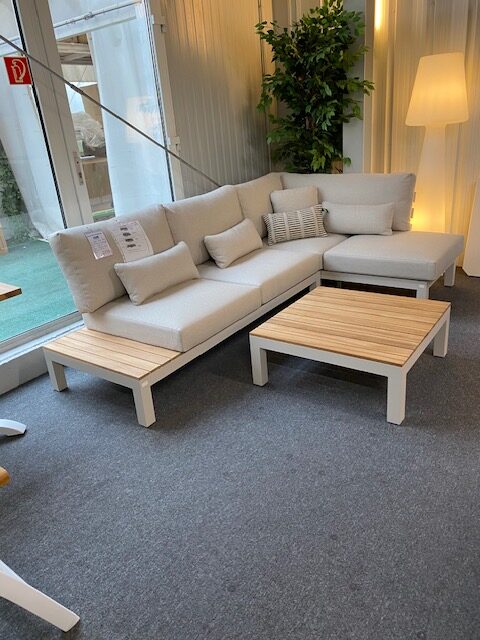 Ess Lounge Alu weiß, mit Teakarmlehen Ecksofa 234x234cm, Tisch 115x115x70cm. Ausverkauft