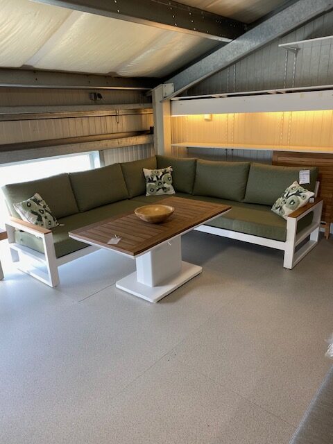 Lounge Alu weiß, mit Teakarmlehnen. Wetterfeste Kissen grün 253 x 253 cm. Tisch 140 x 75 cm HÖHEN VERSTELLBAR von 48cm bis 74cm. Weitere Alu und Kissen Farben lieferbar.