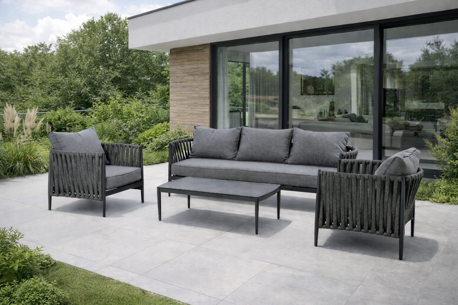 Sofagruppe Alu anthrazit, Rope anthrazit, Kissen grau, Sofa 210 x 85 cm, Sessel ca. B. 85cm., Tisch 120×70 cm H. ca. 45 cm.
